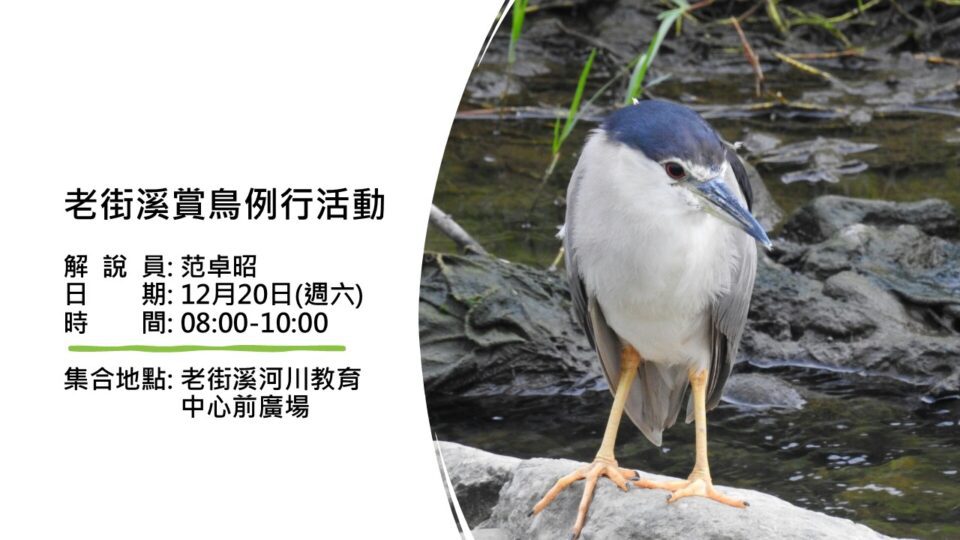 活動主辦人:范卓昭和社團法人桃園市野鳥學會 老街溪河川教育中心前廣場 老街溪周邊生態豐富,…