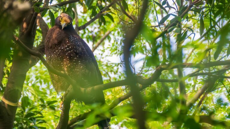 一群人舉著望遠鏡看著躲在樹林深處的大冠鷲!