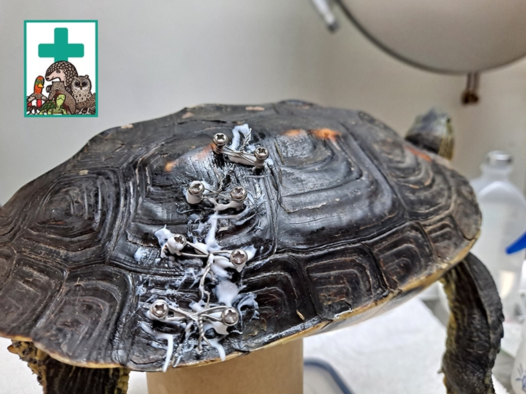 好在這隻斑龜的裂縫雖然很深,傷口也很大,但並不複雜,因此手術也很快地就結束了,獸醫將上下交錯的龜殼復位後,利用螺釘固定。術後的恢復非常順利,斑龜小姐很快就從麻醉中恢復了精神,然而漫長的傷口照護才剛剛開始。烏龜的甲殼復原速度很緩慢,復原期可以長至兩三個月甚至半年,以往診所收入的裂殼烏龜,都會在診所住個大半年才會野放。